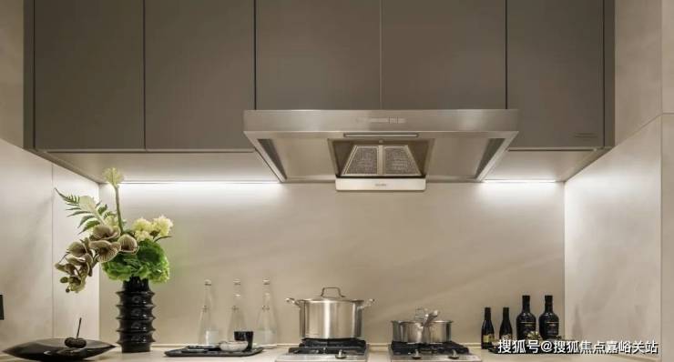 油烟机下方铺设的整块岩板,采用的是意大利 璞丹娜Casalgrande Padana(或同等档次品牌) 岩板,主打一个恢弘大气。