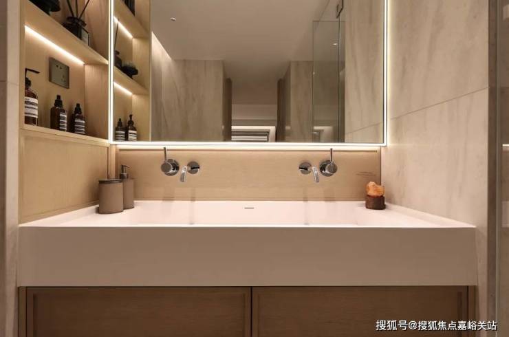 主卫淋浴、双台盆,选用 国际一线品牌龙头与顶喷花洒,在此基础上,还全面做了 “管道的消失”工艺。
