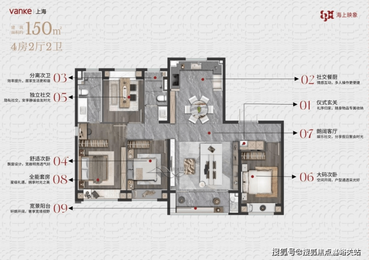 约150㎡4房2厅2卫,打造“家庭中式圆桌年夜饭、家庭礼仪内外双玄关、标准四房外客厅I型空间”,更以“主卧小家化”理念重新考量主卧尺度,打造双人阅读工作台、独立衣帽化妆间、舒适卫浴空间等星级酒店的全能套房,更精细划分玄关、客餐、飘窗等八大精准运用的弹性收纳空间,妥帖收藏映象家人的一切欢然时光。