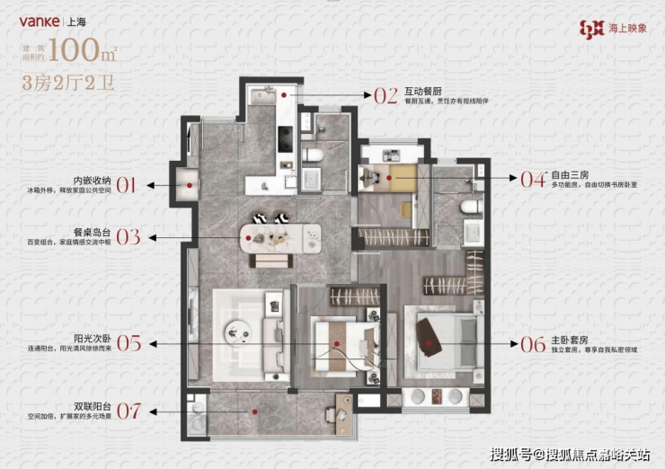 约100㎡3房2厅2卫,通过“长岛桌台”设计,呈现一个“有大桌子的家”,不仅将传统狭长过道餐桌拓宽为长岛社交区,更搭载多收纳功能桌台,包容工作娱乐用餐等多元场景,让餐桌升级为全家庭生活故事演绎中心。还用“分户S墙”设计在分户墙处增设“凹型空间”,“冰箱外移”增加厨房操作台面和收纳空间,让厨房从L升级为U型,创造更合理的餐厨桌台动线。