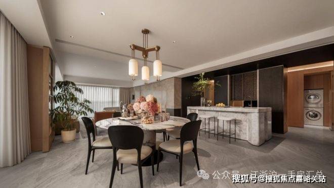 厅内空间充裕,既容得下大家庭聚餐的超大圆桌,也有独立西厨岛台,满足高净值家庭多元烹饪需求。