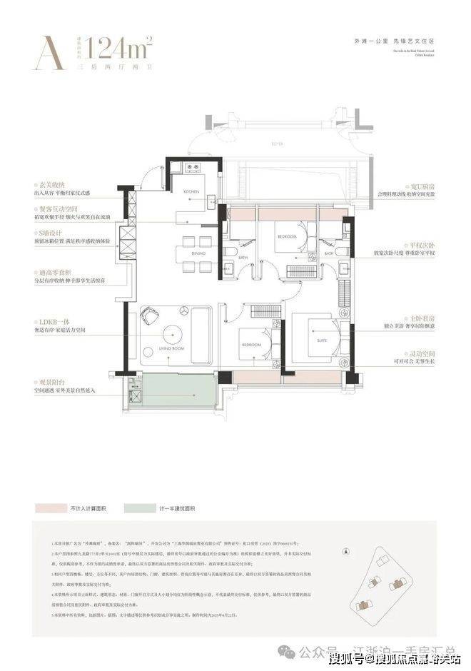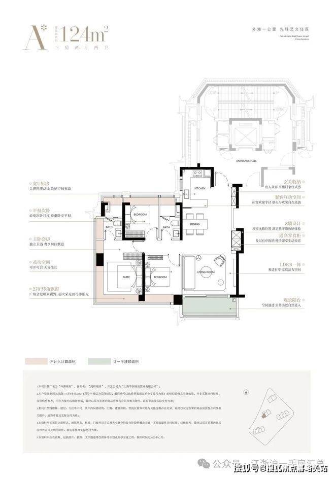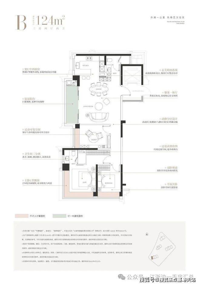 建面约 124㎡三房两厅两卫:三开间朝南,南向面宽超 11 米,全景落地窗 + 双联阳台,5 大飘窗赠送,得房率高,总价约 1693 万起,低门槛入驻外滩核心。