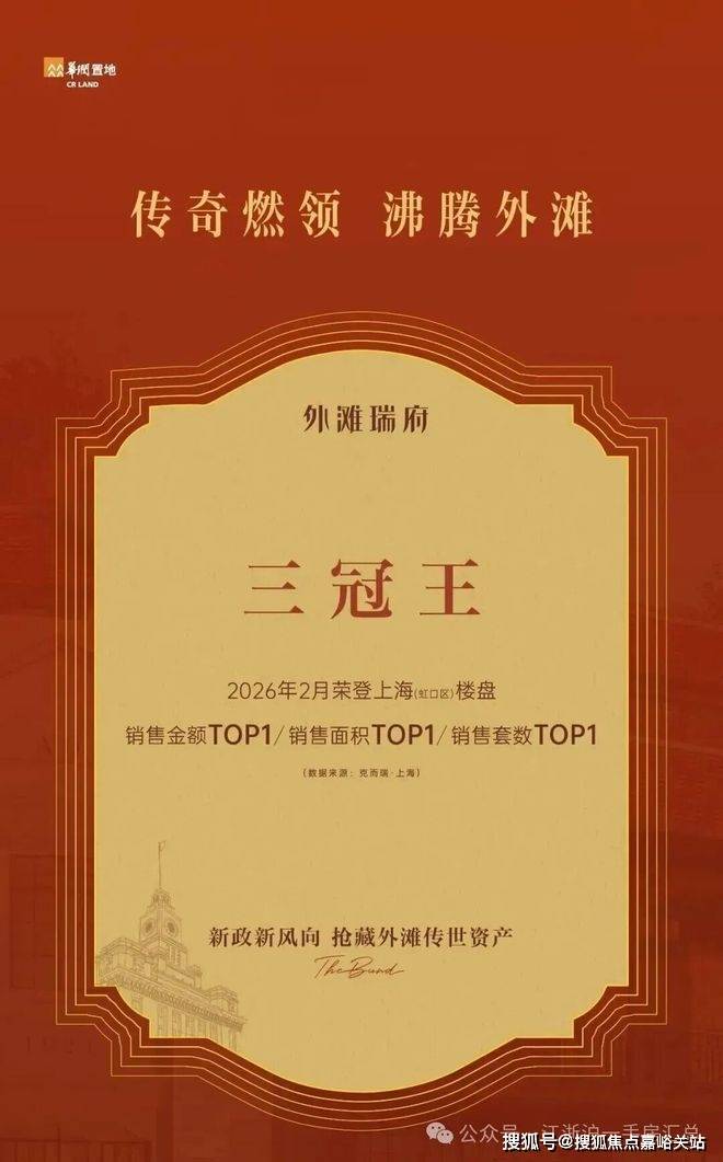 这是项目官方发布的海报,外滩瑞府荣膺2026年2月虹口区新房三冠王。