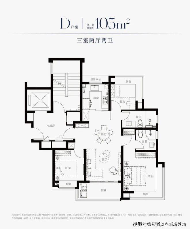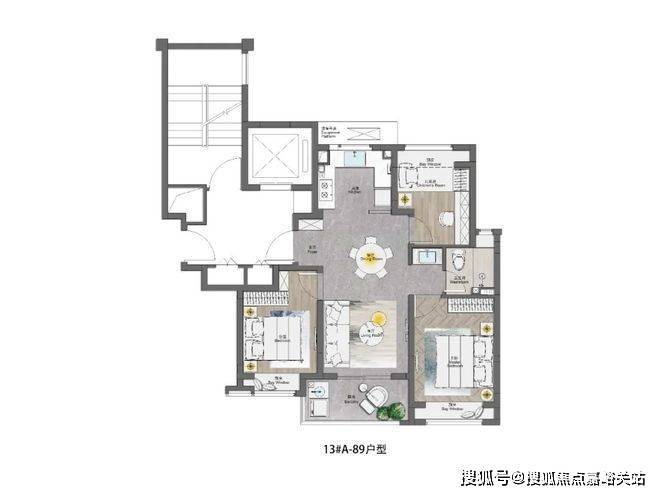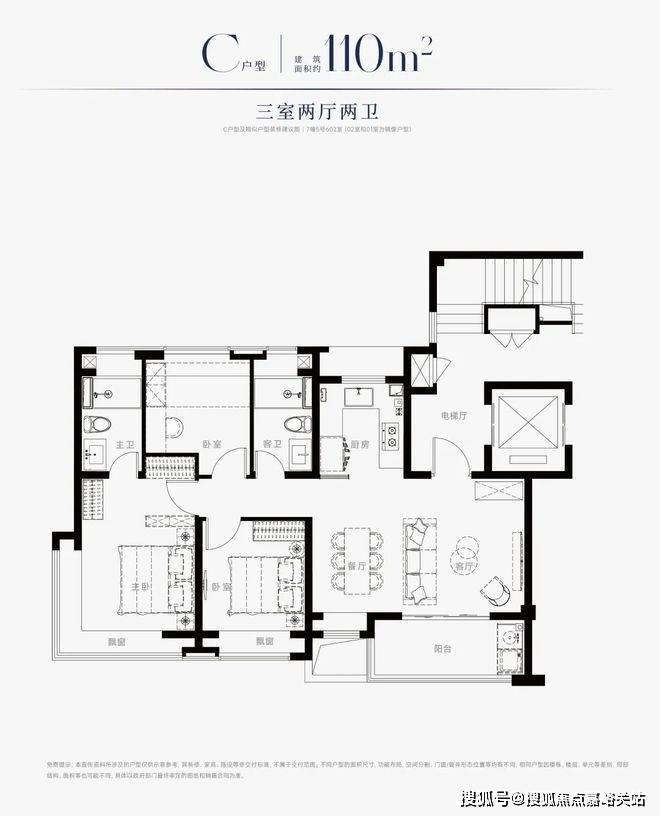 此户型在103㎡户型的基础上,将南向主卧、北向次卧均升级了约270°转角飘窗设计,采光视野及美观性都得到了极大提升。
