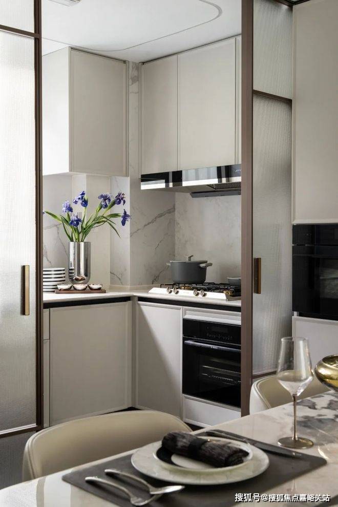 厨房方面,项目 全系标配中西厨搭配,中间用无地面链条设计的海派金属玻璃移门隔开,使厨房地面与客厅打通,通铺的简一地砖,