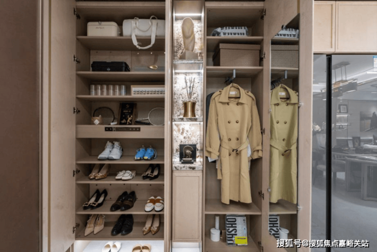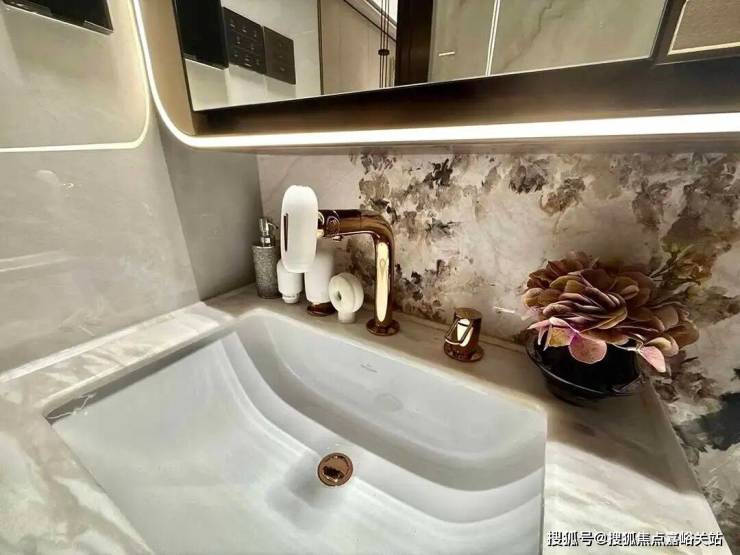 100㎡A户型,入户玄关透光「雪山银狐」奢石,让人惊鸿一瞥,如置身纯净广袤的自然雪域,净澈本心;客厅背景墙「幻日流光」岩板,质感细腻,如大地流沙,阳光洒在上面,更折射出璀璨柔和流光。室内大面积影木木饰面,更与灵石相互协奏,平衡出空间的温润静奢格调。