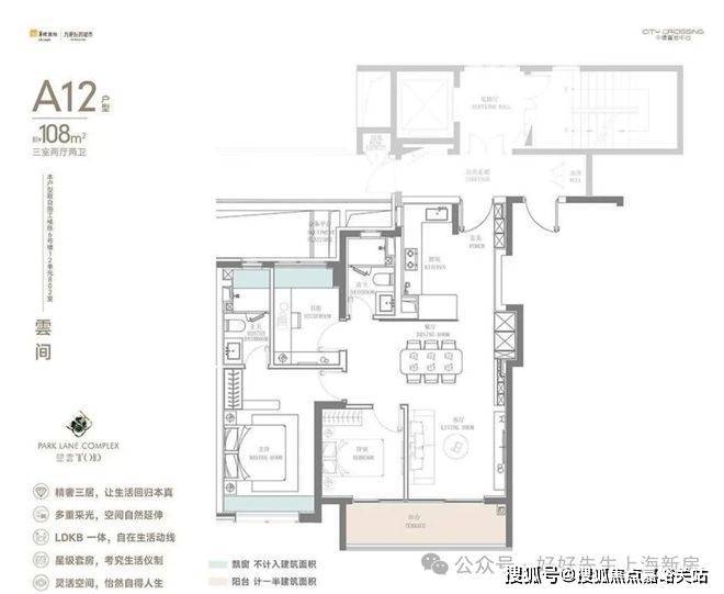 望雲的户型设计堪称业内标杆,此次加推的建面约108㎡户型,虽面积紧凑,却完美实现了三房两卫的舒适布局,南北通透、双卫设计,南向面宽约10.2米,客厅搭配同尺度阳台,采光通风俱佳。