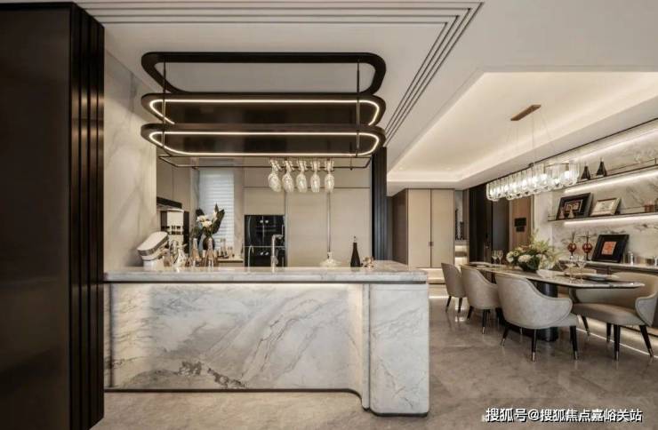 客厅背景墙的“烟雨江南”天然大理石,不同于传统平面背景墙,通过弧度及立体的造型处理,并镶嵌不锈钢材质!对于金茂而言,比奢石昂贵的,是让奢石真正与空间气场融为一体!