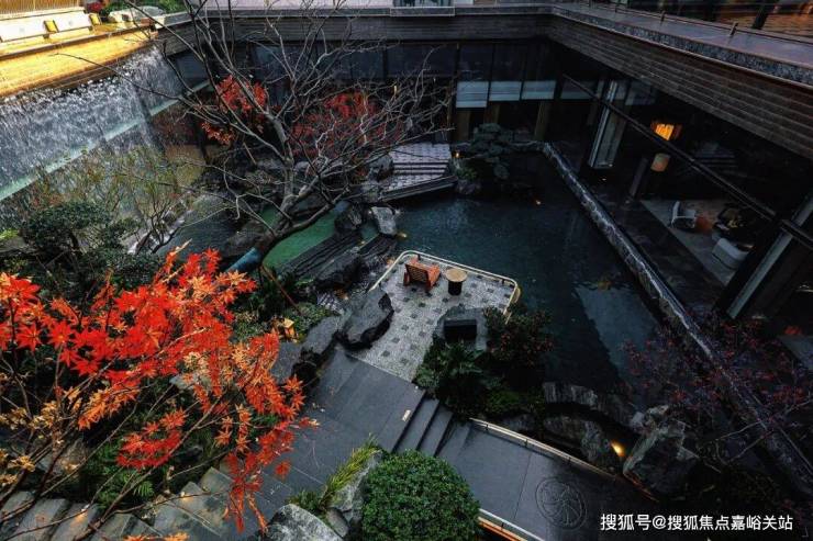巧妙利用地块天然的高差,一座气势沉静的超长瀑布应运而生,水流声将城市的喧嚣温柔隔绝,营造出穿行于都市幽谷般的沉浸感。