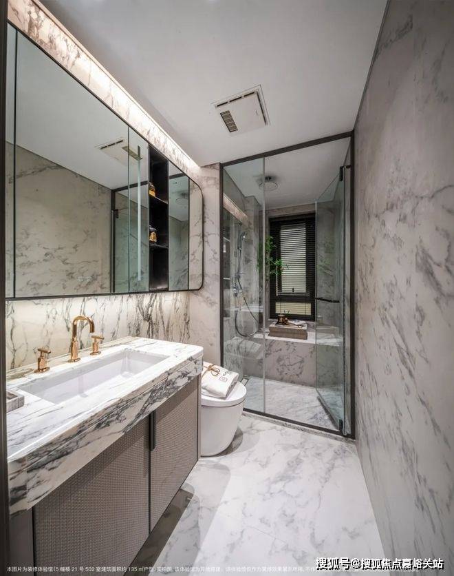 卫生间墙面采用大面积岩板,台盆柜处定制镀金龙头;另外超大镜面柜内配置了充电口,方便剃须刀、电动牙刷等工具收纳。