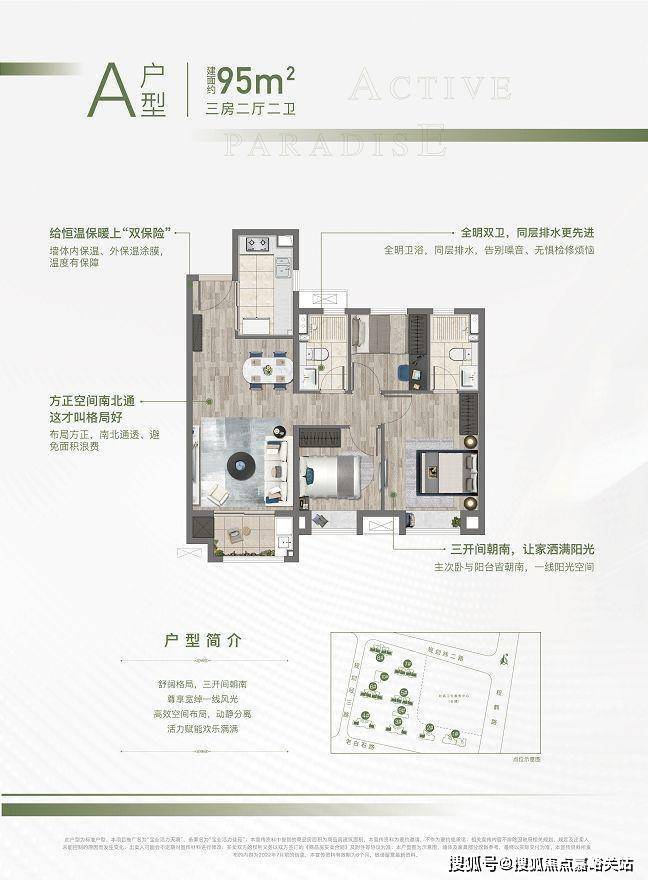 1、约95㎡的三房,南北通透,全明设计,三开间朝南,户型方正。