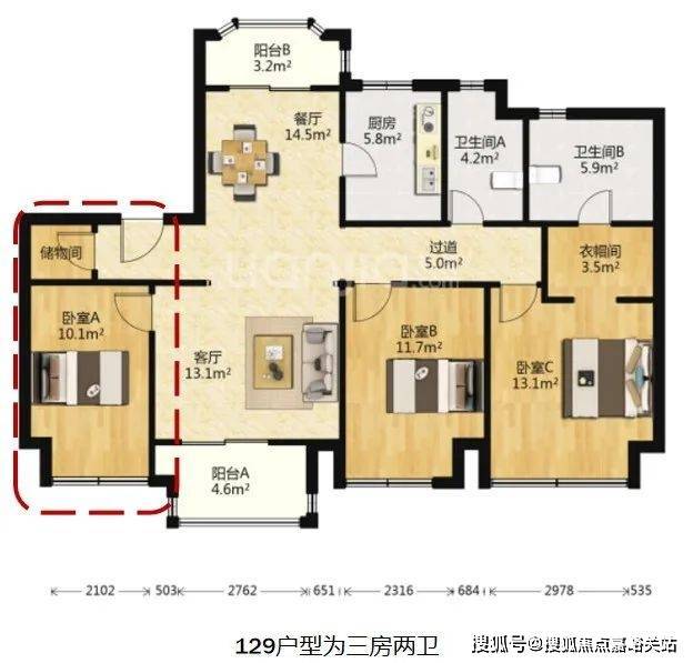 除了 四开间朝南、全卧朝南之外,该户型还拥有诸多亮点: