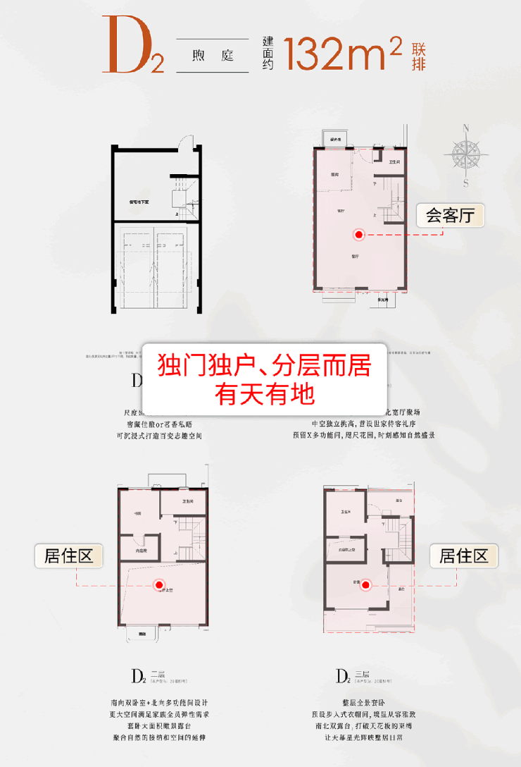 项目主推建面约132㎡联排别墅,拥有前庭后院+超大挑空 +南北双星空露台+室内庭院等超享空间,是一院一厅间的无界私院。