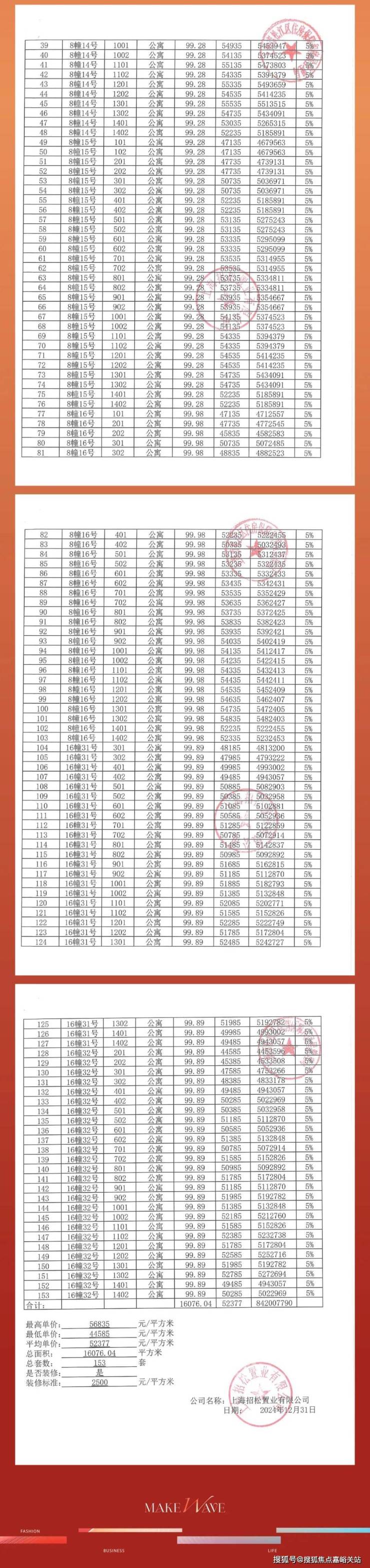 3个项目中,泗泾镇有一个项目,为星誉铭庭(外婆泾路750弄)153套公寓,备案均价52377元/平方米。