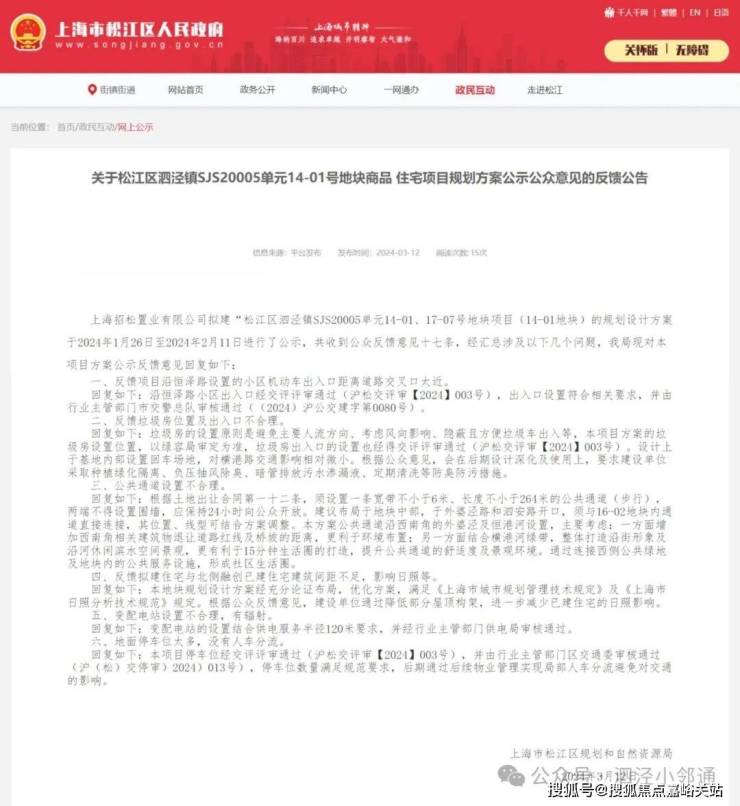 2024年3月12日,上海市松江区规划和自然资源局发布《关于松江区泗泾镇SJS20005单元14-01号地块商品住宅项目规划方案公示公众意见的反馈公告》,具体可点击以下链接查看: