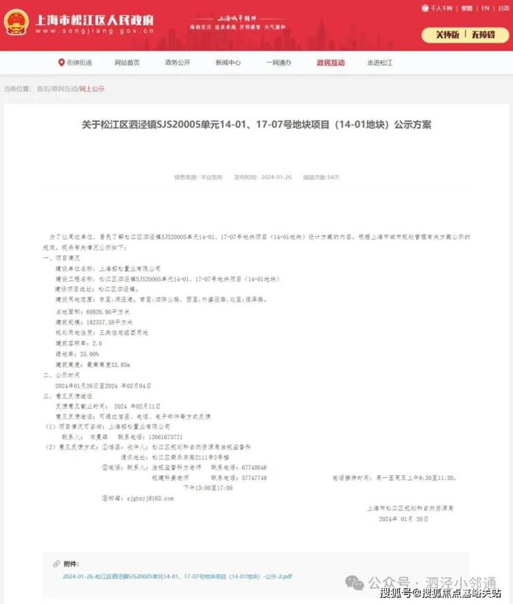 2024年1月26日,上海市松江区规划和自然资源局发布《关于松江区泗泾镇SJS20005单元14-01、17-07号地块项目(14-01地块)公示方案》,具体可点击以下链接查看: