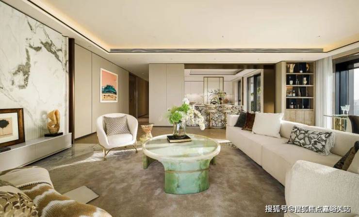 电视墙及玄关背景墙采用 意大利奢石芬迪白,独特的玉质感与流动纹理如山水画,而且保利贴心的提供了多款石材可供选择,将高定推向极致! 保利世博天悦售楼处电话:400-8894-986(官方24小时热线1-1在线预约)