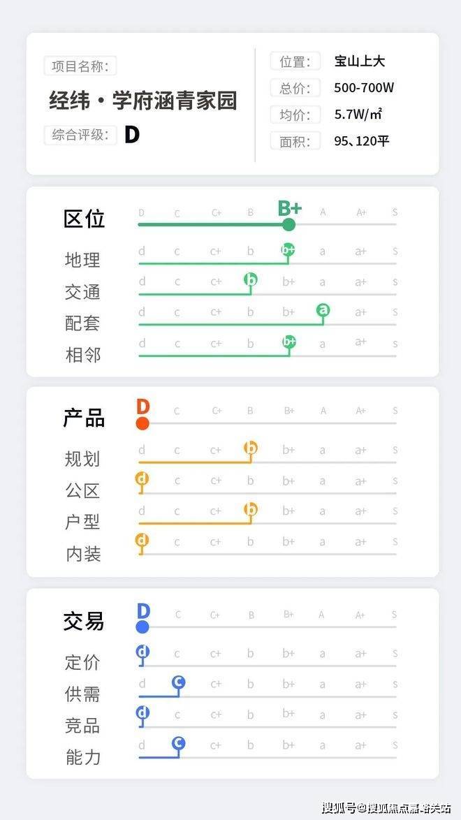 再看产品评级给到D,其中规划与排布b,公区d,户型b,内装d。
