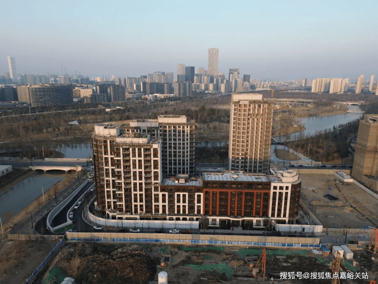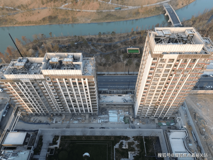 从高空视角清晰可见,项目01地块已经全部封顶,红色的“封顶大吉”横幅悬挂在楼栋顶部,在阳光下格外醒目,一眼就能看到。楼栋排列得整整齐齐,没有杂乱无章的布局,新海派风格的建筑轮廓线已经初步显现,辨识度很高,不同于市面上千篇一律的江景房设计,这种新海派风格,既有老上海的典雅底蕴,又不失现代摩登感,从高空看,整体造型简洁大气,很有质感。