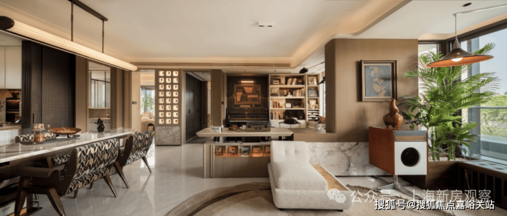 从示范区的打造上来看,保利打造了度假感氛围!采用了国际度假酒店的打造手法,从门头、 具有海蓝色的水景 、 海岛感的花园植物 , 丰富艺术品的植入 ,以及非常亮眼的 上海首个浮雕水景艺术卡座 ,营造轻松、惬意的氛围,像这样的松弛场景在项目中数不胜数,给到客户强烈的度假感和松弛感。