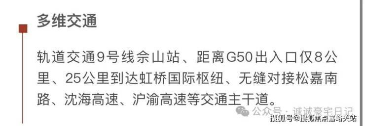 交通:地铁9号线洞泾站约3.2公里、佘山站约3.5公里;三横G50-G318-G60 三纵:G15-G1503-嘉松南路;嘉松南路、沈砖公路、佘天昆路、沪青平高速公路、嘉松公路、沪杭高速等四通八达;