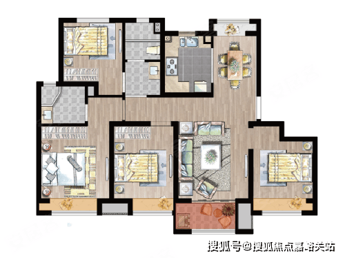 四开间朝南,采光面超 12 米,南北双阳台,主卧套房带独立卫浴与衣帽间,四叶草布局,适配三代同堂
