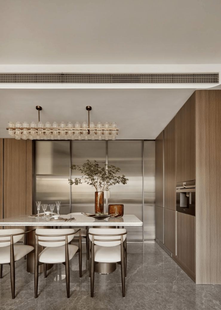 从装修上来看,中央空调、新风系统、地暖三大件配齐,均选用知名品牌,保障品质;厨房位置标配了灶蒸烤一体机,以及空调油烟机,很细腻地考虑到业主在厨房做饭时的舒适感。卡萨帝冰箱内嵌于餐厅柜,既保证更大容积,也实现和谐一体。