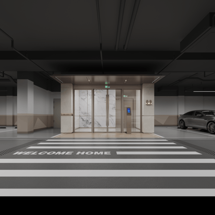艺术审美也落到了各个细节之处,南侧与西侧则兼顾了车行与人行,开车回家驶入地库坡道,抬头可见梦幻星空顶,极具质感的柔光灯具,营造出璀璨天幕的氛围,瞬间带来高端、宁静的归家体验;从车库步入酒店式回家大堂,整体风格与一层大堂保持一致,同样精致细腻的背景墙带来静谧奢华的氛围,驱散疲惫,洋溢家的温暖。