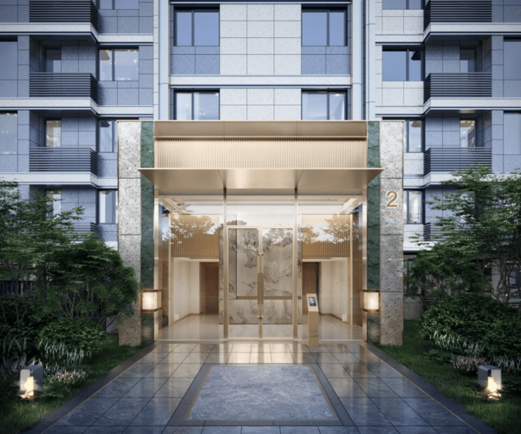 小区入户大堂的门头采用了绿色奢石、香槟金色铝板、石材等不同材质构建出了沉稳却又令人惊艳的效果,而金属线条冷峻直立的走向,与高透光玻璃的柔和影像碰撞,打造出松弛又有律动的节奏。