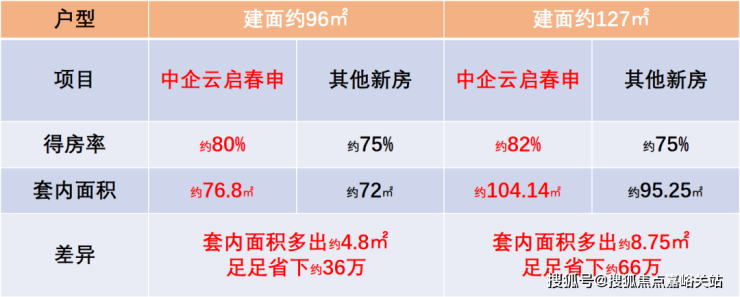 同样面积的户型「中企云启春申」比其他新房多出了约4.8-8.75㎡的套内面积。换算到约7.5万/㎡的均价,那可是大几十万的真金白银。