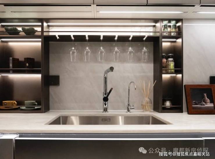 比如说餐边柜+操作台+洗手台一体化设置,让这个空间不再单独的满足于简单的吃饭、客厅休憩。