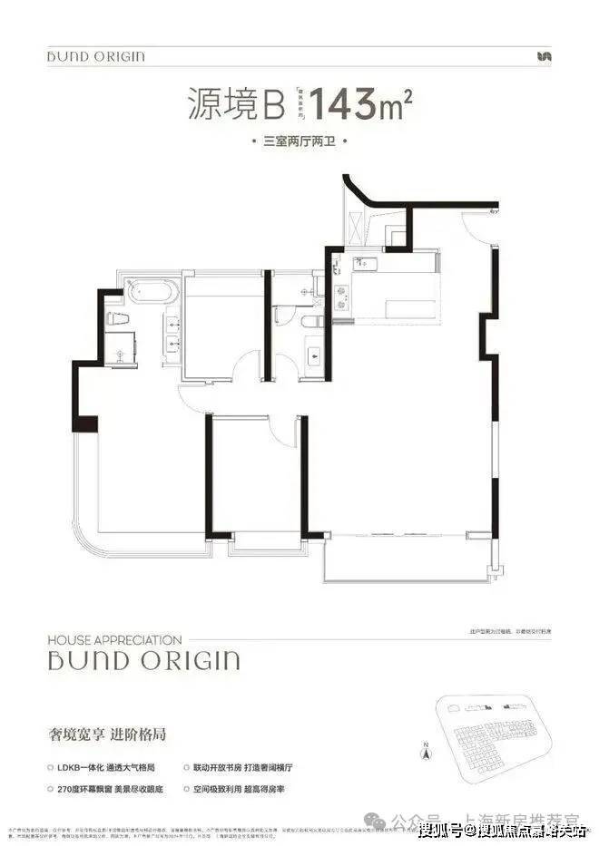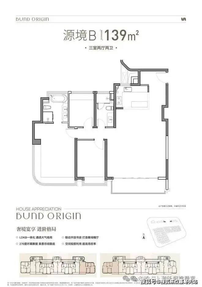 B户型是3房2厅2卫格局, 三开间朝南+LDKB一体化+奢阔宽厅+全卧室带飘窗+主卧套房设计+动静分离+主卧270度飘窗,舒适度更高。