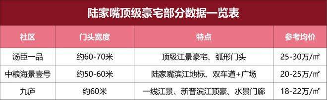 我们找到了汤臣一品、中粮海景壹号、九庐等陆家嘴一线滨江顶豪,发现他们的门头尺度,基本也都在50-70米之间,但是这些豪宅的价格无一不是在20万左右。