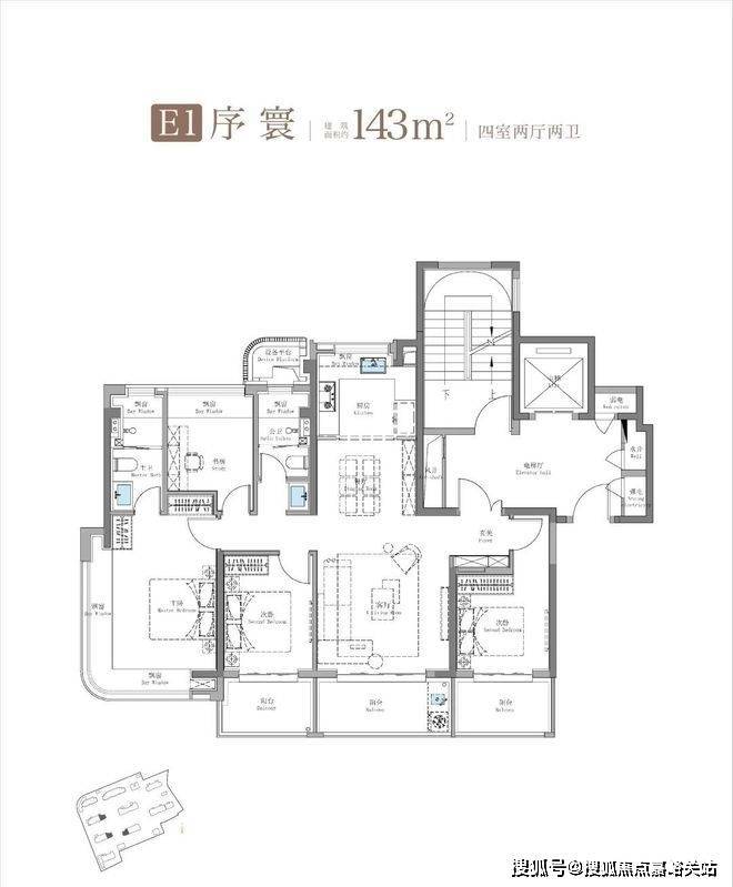 建面约143㎡4房是南北通透、四开间朝南的户型格局。