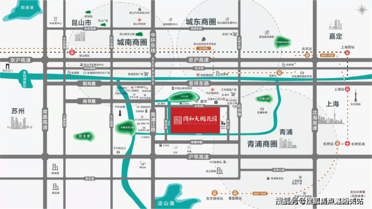交通配套:三公里抵达沪常高速、京沪高速;公交 253 路直达上海 11 号线花桥站;C3 路、毗邻公交C11 路接驳上海 17 号线漕盈路地铁站;经上海绕城高速,北青公路、外青松公路通往各处;“中环线南延”工程;苏沪淀城际铁路S3正在规划建设中(途径站点淀山湖、锦溪、张浦、千灯);轨交 K2 线