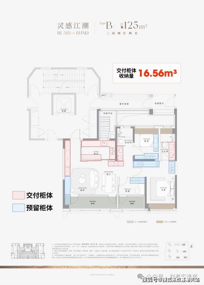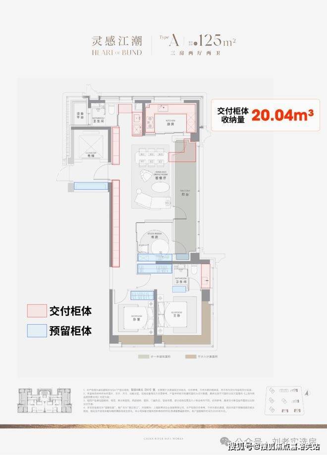 据小编手工统计,项目125㎡3房边套户型的整体交付柜子+预留衣柜,收纳空间可以达到约20.04m³!中间套户型也能达到约16.56m³!