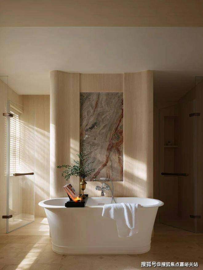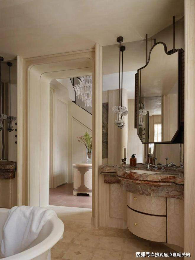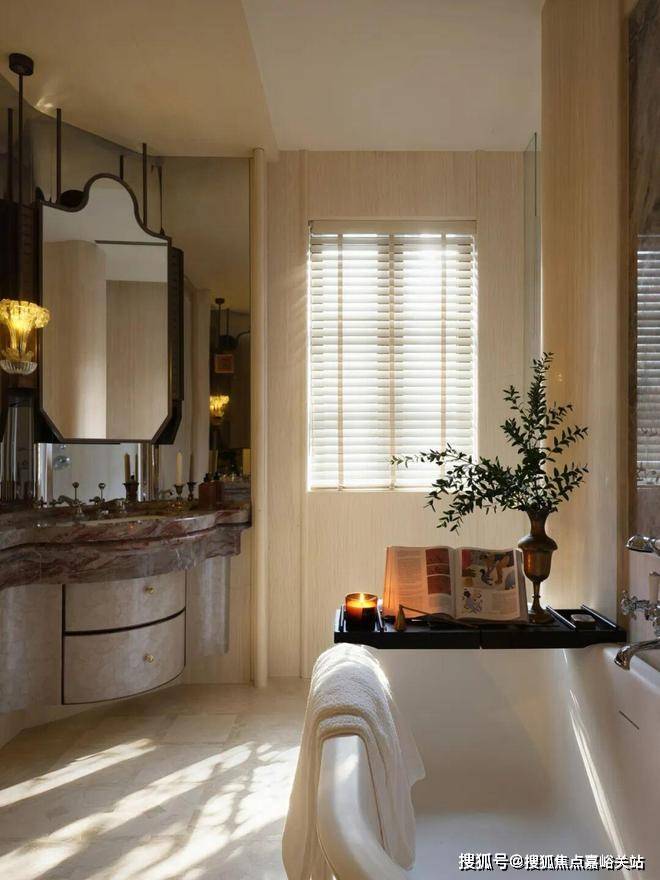主卫空间弥漫着复古气息,温润大理石赋予空间从容典雅的气质,营造出静谧而舒适的私属氛围。