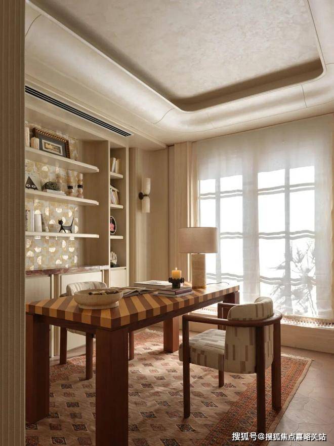 在弘安里,二楼亲子书房内,✨✨✨【弘安里】售楼处电话:4001185086✔✔✔❤❤❤加宽胡桃木书桌便于共读,✨✨✨【弘安里】售楼处电话:4001185086✔✔✔❤❤❤中古烛台与装饰画《庇护所》相映成趣,延续着“崇文重教”的家风。