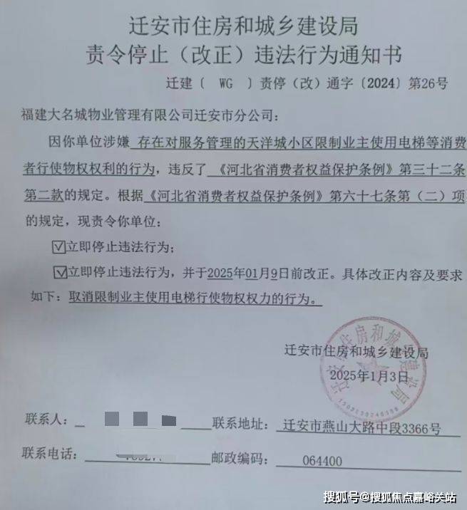 红星新闻记者获取的这份责令整改通知书显示,福建大名城物业管理有限公司迁安市分公司涉嫌存在对服务管理的天洋城小区限制业主使用电梯等消费者行使物权权利的行为,违反《河北省消费者权益保护条例》第三十二条第二款的规定。根据《河北省消费者权益保护条例》第六十七条的规定,责令立即停止违法行为;于2025年01月9日前改正。此外,取消限制业主使用电梯的行为。