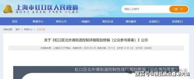 2020年2月20日公示了关于《虹口区北外滩街道控制详细规划修编(公示参与草案)》。