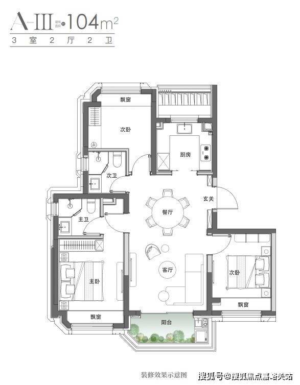 1、104㎡户型是功能性与空间的完美平衡,房间数量适宜。三室户型可以满足夫妻、孩子和一位老人/保姆/书房的多功能需求,实现了“一步到位”的家庭结构覆盖。