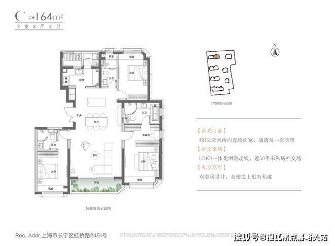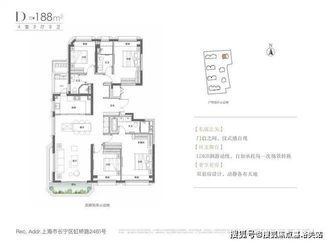 动静分离,市面上比较少真正的动静分离户型,这一户型就有效地将生活区和社交区分割开了,保证居家的静谧生活;