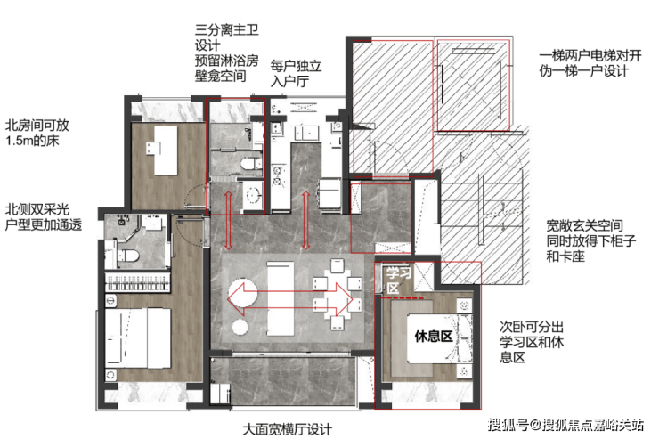 建面约90㎡的3室2厅2卫,一梯两户的设计, 有着不低的得房率。