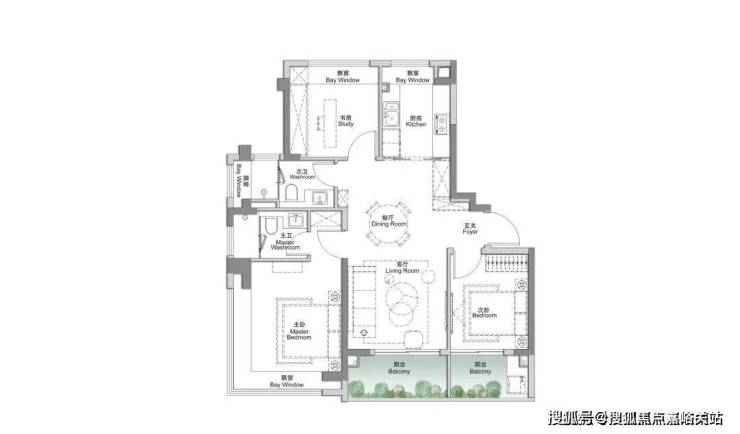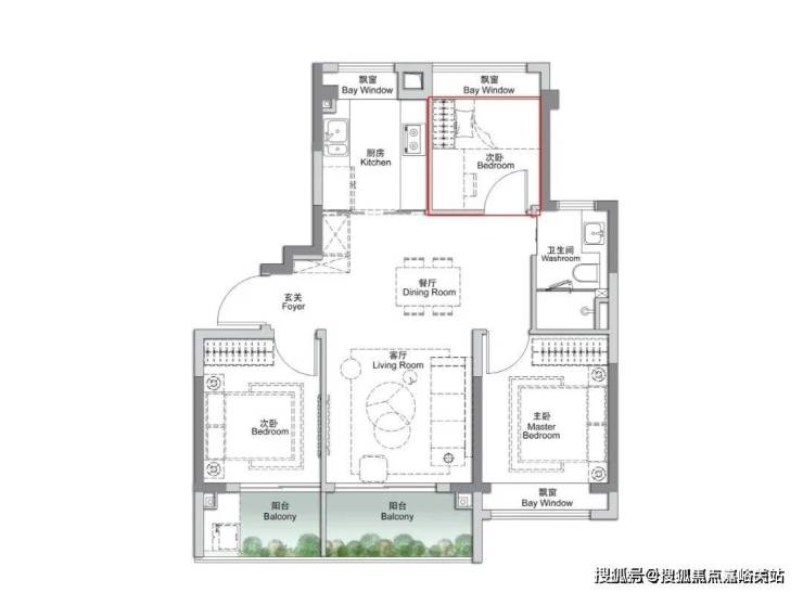 这个户型除了三开间朝南,再加上“3个飘窗+双面阳台系统”,采光通透性非常高优势之外,业主还可根据家庭结构与生活需求,灵活将空间定制为3房或者2+1房。