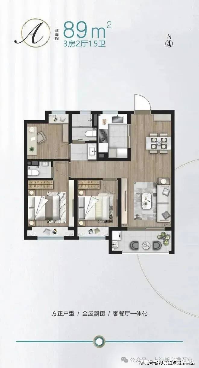 建面约89㎡做3房,功能性上就占尽先机,没想到项目还有1.5卫配置, 主卧升级套房,真正实现一步到位!