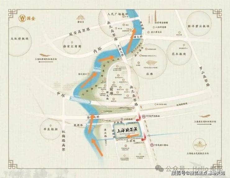 「上海桃花源」位于浦东的闵行区浦江街道,是前滩板块旁的首席配套居住区,开车听两首歌的时间就能到前滩,再听一会FM101.7上海流行音乐广播就能到达人民广场、南京西路、百年外滩、陆家嘴国金中心、淮海路IFC、新天地商圈、联洋碧云国际社区、徐家汇恒隆广场,可以说是融合浦西浦东真正精华的地段!