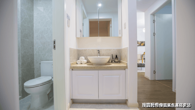 也正是因为一个卫生间,才能做出这样的尺度感。镜柜打开就是收纳空间,整体干湿分离,一边可以洗脸刷牙,一边可以上厕所,尽可能满足多人口使用的需求。即使早上也来得及,三口之家的使用绰绰有余。