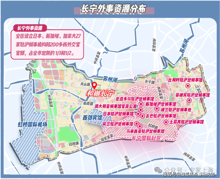 若论上海的国际化浓度,长宁区堪称当之无愧的“全球会客厅”。从官方人口数据来看:2024年长宁区登记境外人口达8万余人,占 全市境外人口总量的1/5以上 ,远超其他中心城区。尤其是古北、天山、金虹桥所在长宁的中部地区有来自 50多个国家和地区 的外籍人士,形成了 “小联合国” 式的居住格局。 (数据来源:上海长宁)
