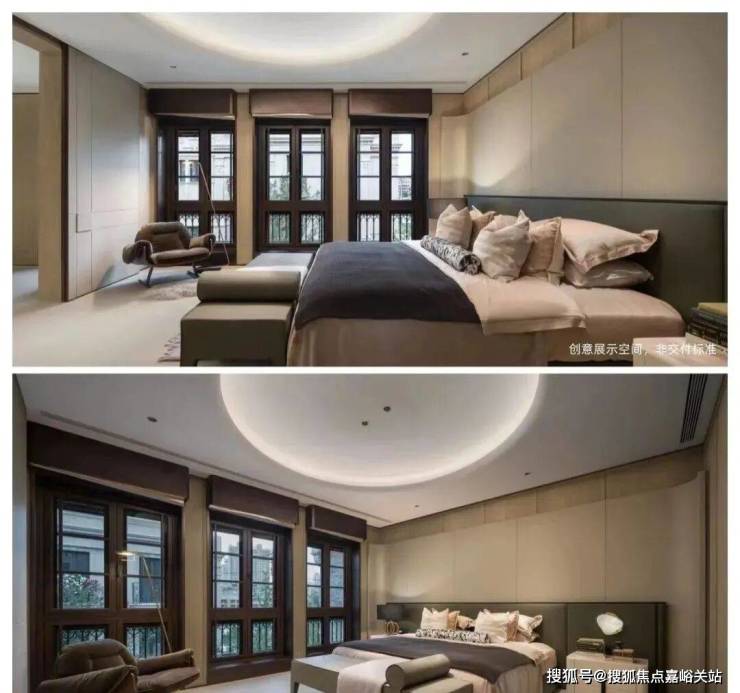 三楼整层为主卧套房,样板间设计了双开门入卧室,进入起居空间,样板间选择在这里放一些艺术装饰、设计吧台来彰显主人品味。