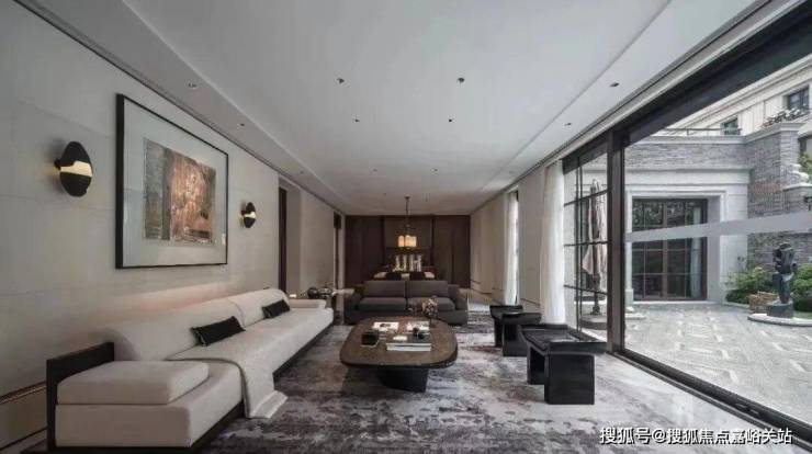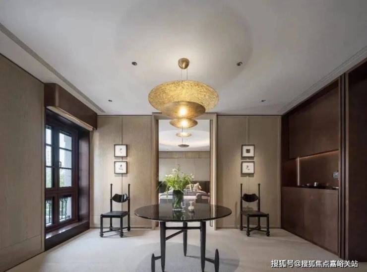 整体一层空间的东南方向,样板间设计为了茶室,配合西向落地玻璃窗,同样正对庭院。